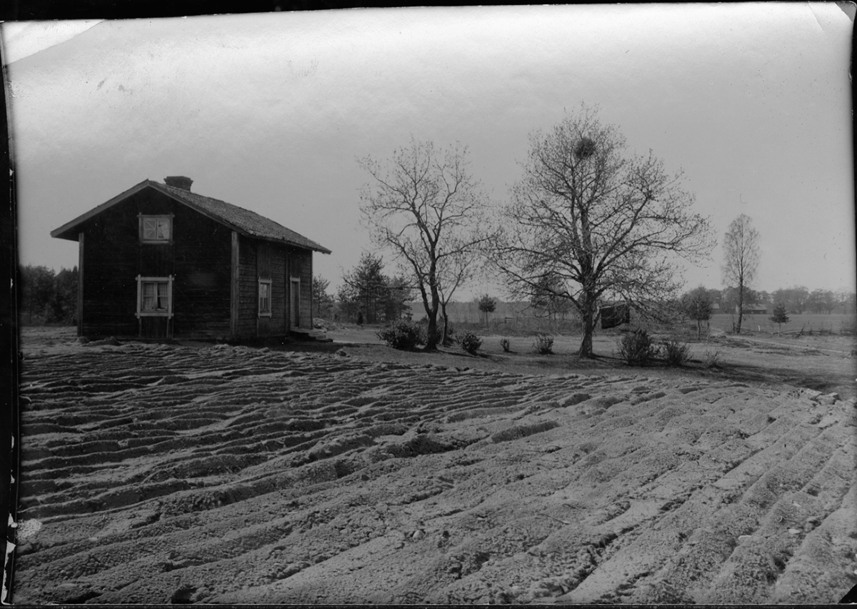 Abraham Jonsson, Hjärtum 1875-01-13, sår 23 maj 1908. Harven ligger kvar på åkern. I bakgrunden syns ingen väg fram till Brevik.