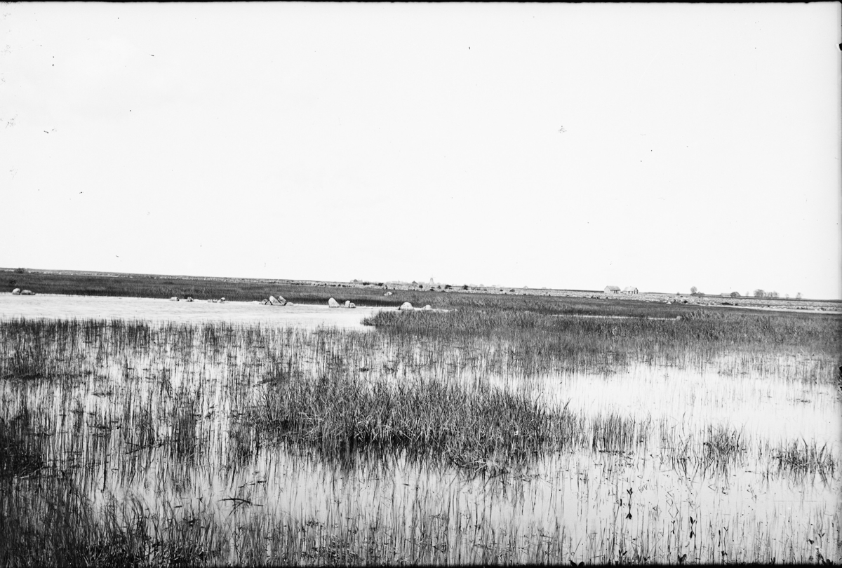 Ladugårdsgrundläggning i Brevik, 7 juni 1909. Johan Fredrik, född Hjärtum 1868-08-01, okänd, Karl Johansson, Hjärtum 1888-05-14. På bilden arbetar man med spett och slägga för att lägga grundmuren till d