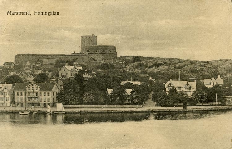 Tryckt text på vykortets framsida: "Uddevalla. Gustafsberg. Strandvägen."