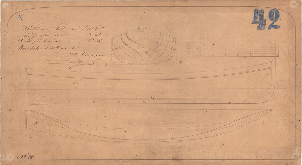23 ft Cutter. Scale: 1:24. Plan showing the body plan, sheer lines with some inboard detail, and longitudinal half-breadth for an 8-oared 23 ft Cutter. Signed Isaac Watts [Chief Constructor of the Navy, 1860-1863].