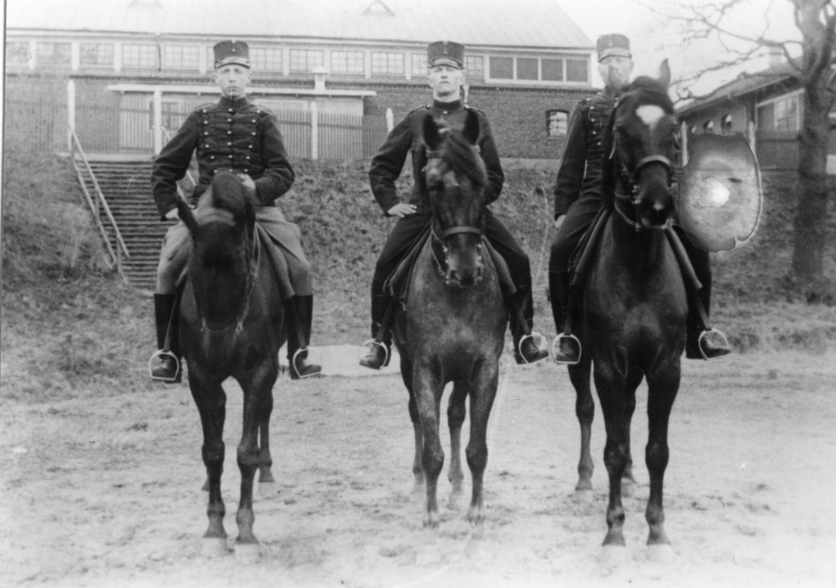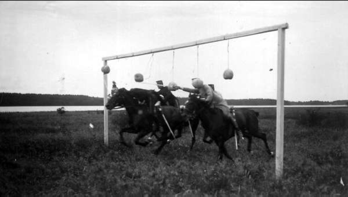 Sabelfäktning till häst på Österängen, Strömsholm 1910-11. Sjön Freden i bakgrunden.