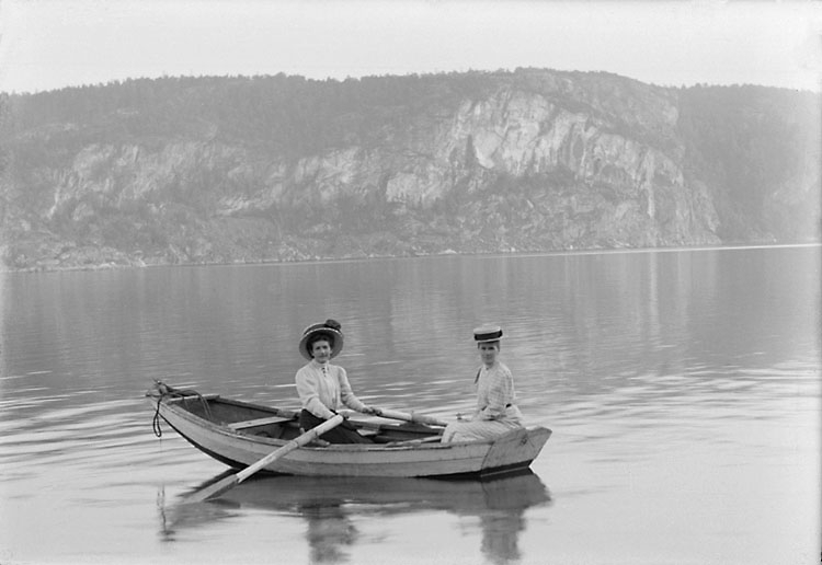 Två eleganta damer i en roddbåt på spegelblank sjö.