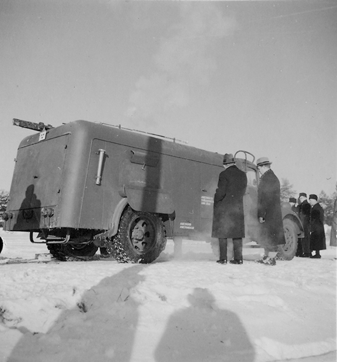 Brandbil på F 2 Roslagens flygflottilj. Öppnad baklucka, med personer framför.