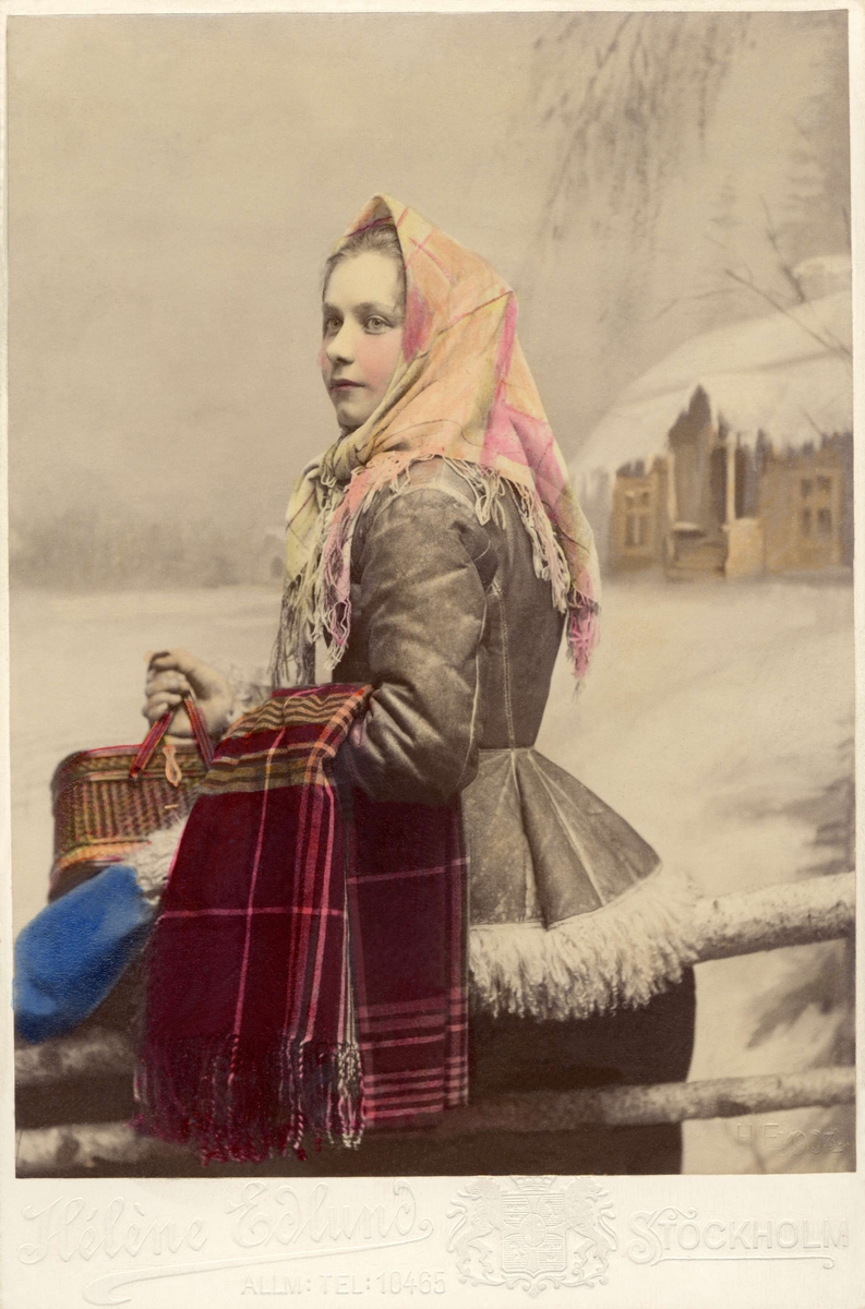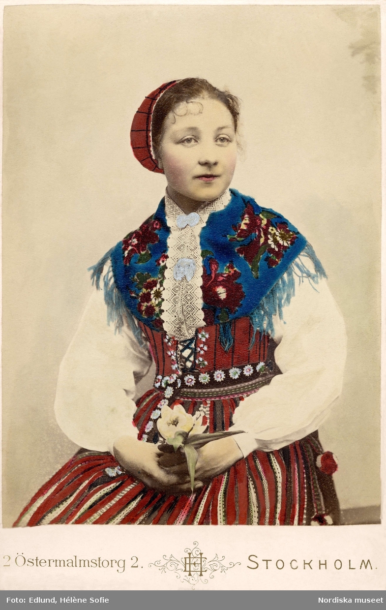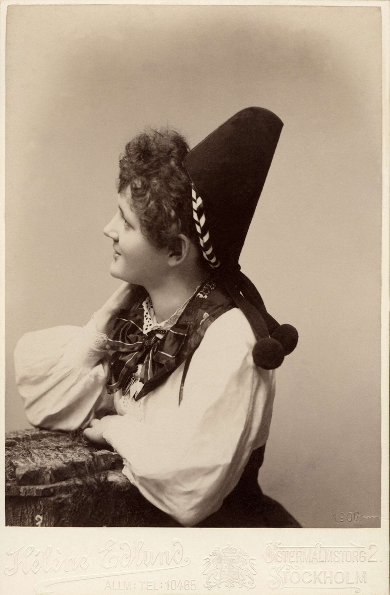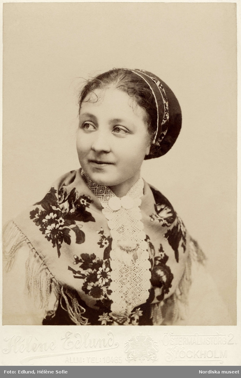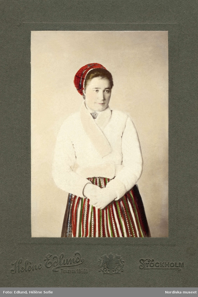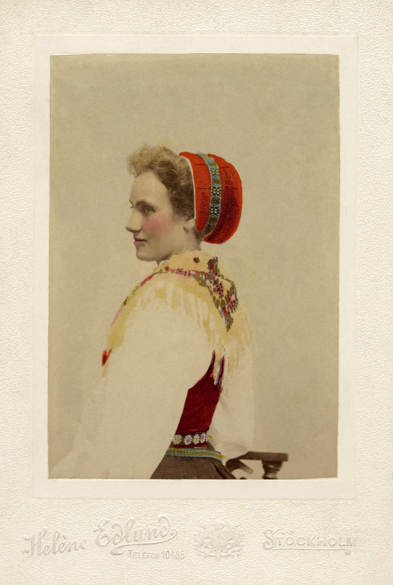 Porträtt på en kvinna klädd i dräkt från Rättvik i utförande från omkring 1900.