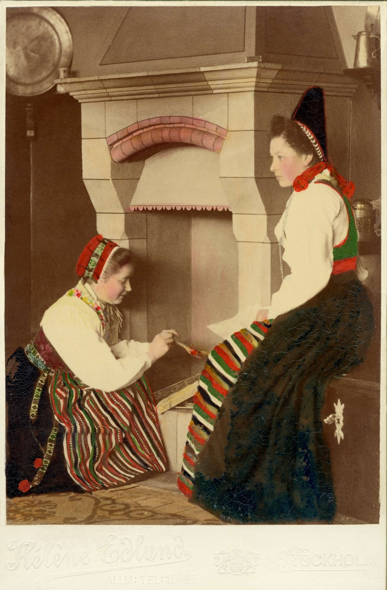 En man och en kvinna poserar i folkdräkter. Klädda i högtidsdräkter från Leksand, Dalarna, kvinnan bär s.k. svartstickshalskläde samt broderade halvvantar i skinn, mannen i långrock med silkebroderier på axl