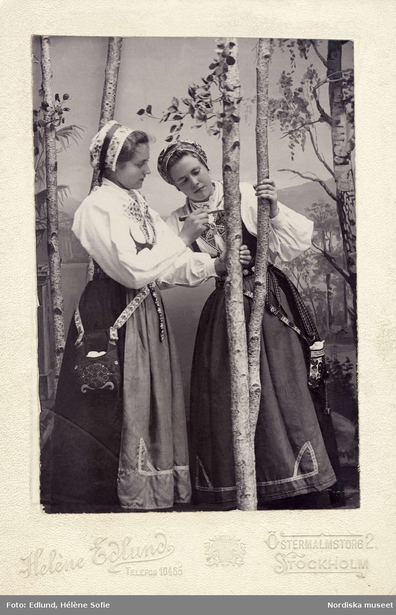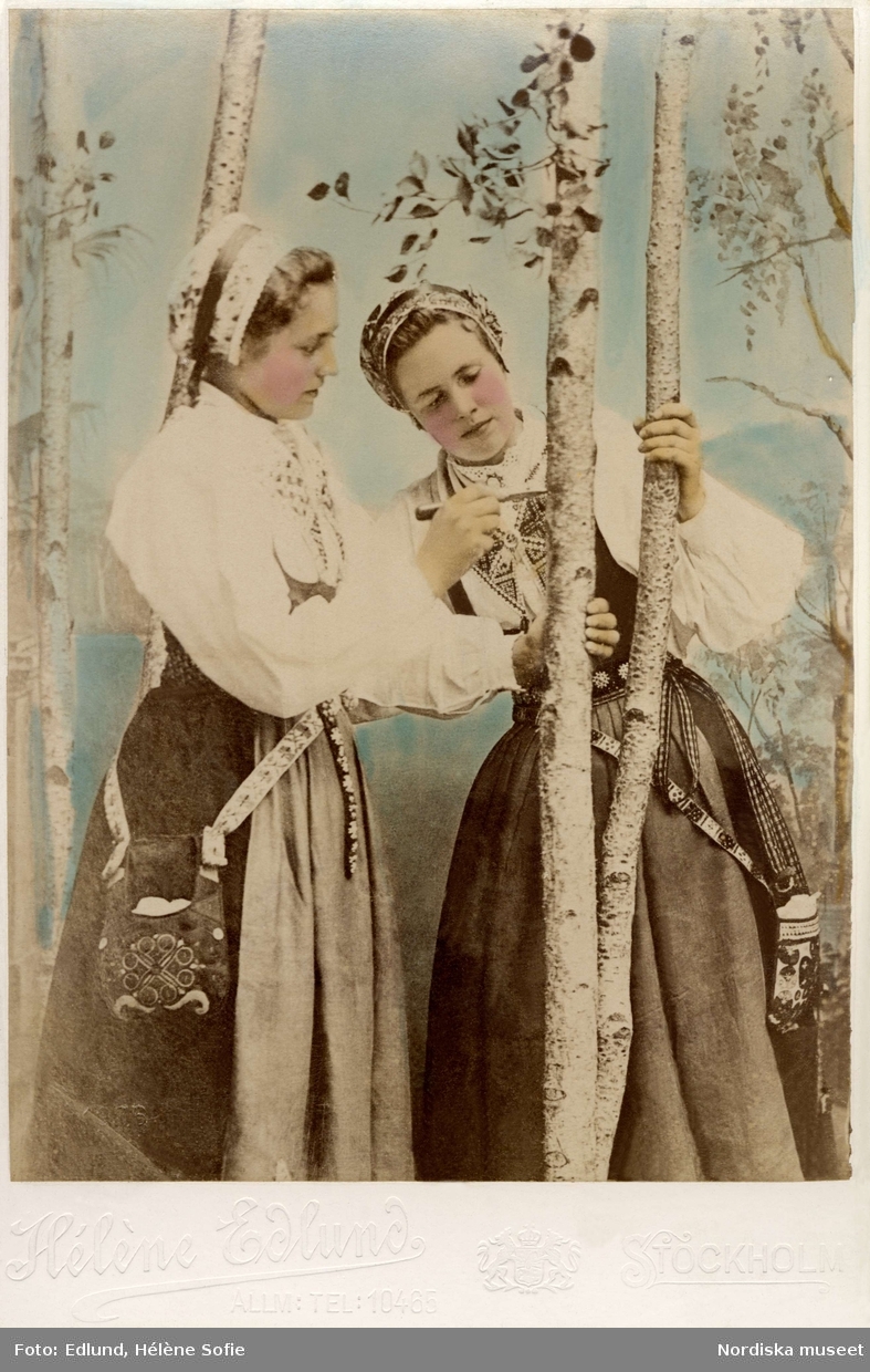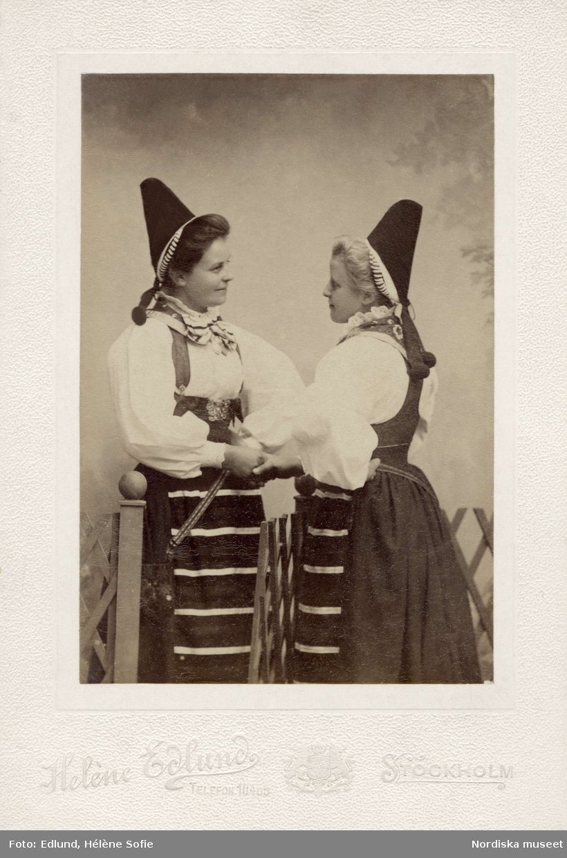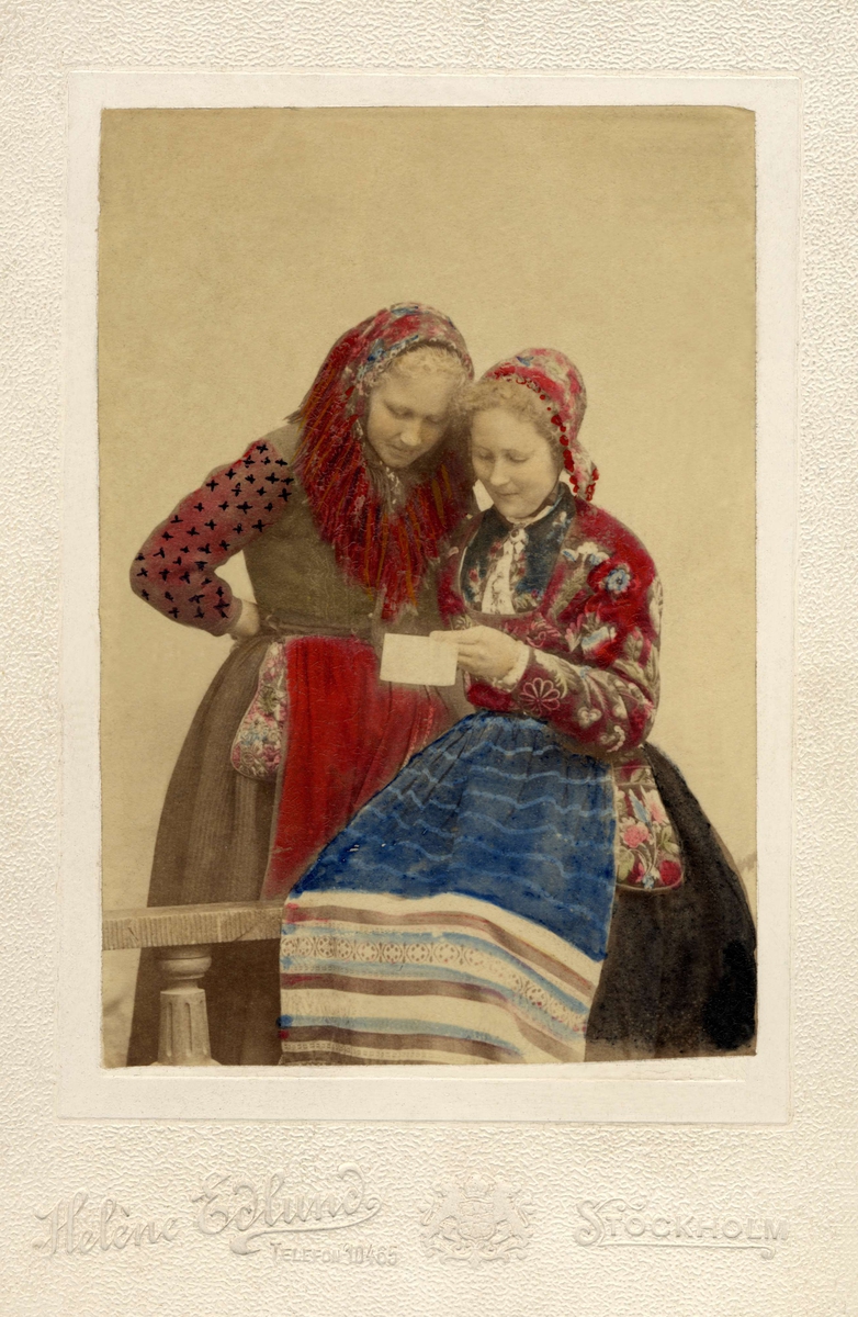 Två kvinnor poserar i folkdräkter, med ryggen vänd mot kameran