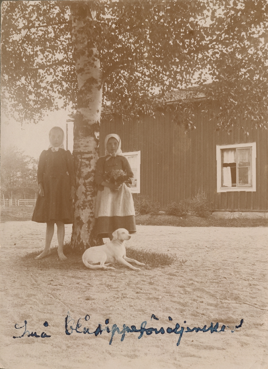 Två flickor med blommor vid en björk på Hälsinge regementets övningsplats Mohed.