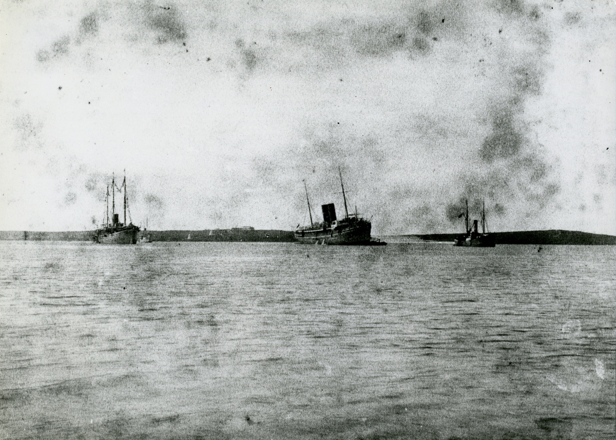 Foto visande post-pch passagerarångfartyget CHINA av London på strandningsplatsen med HERAKLES, BERTHILDE och BERGER WILHELM.