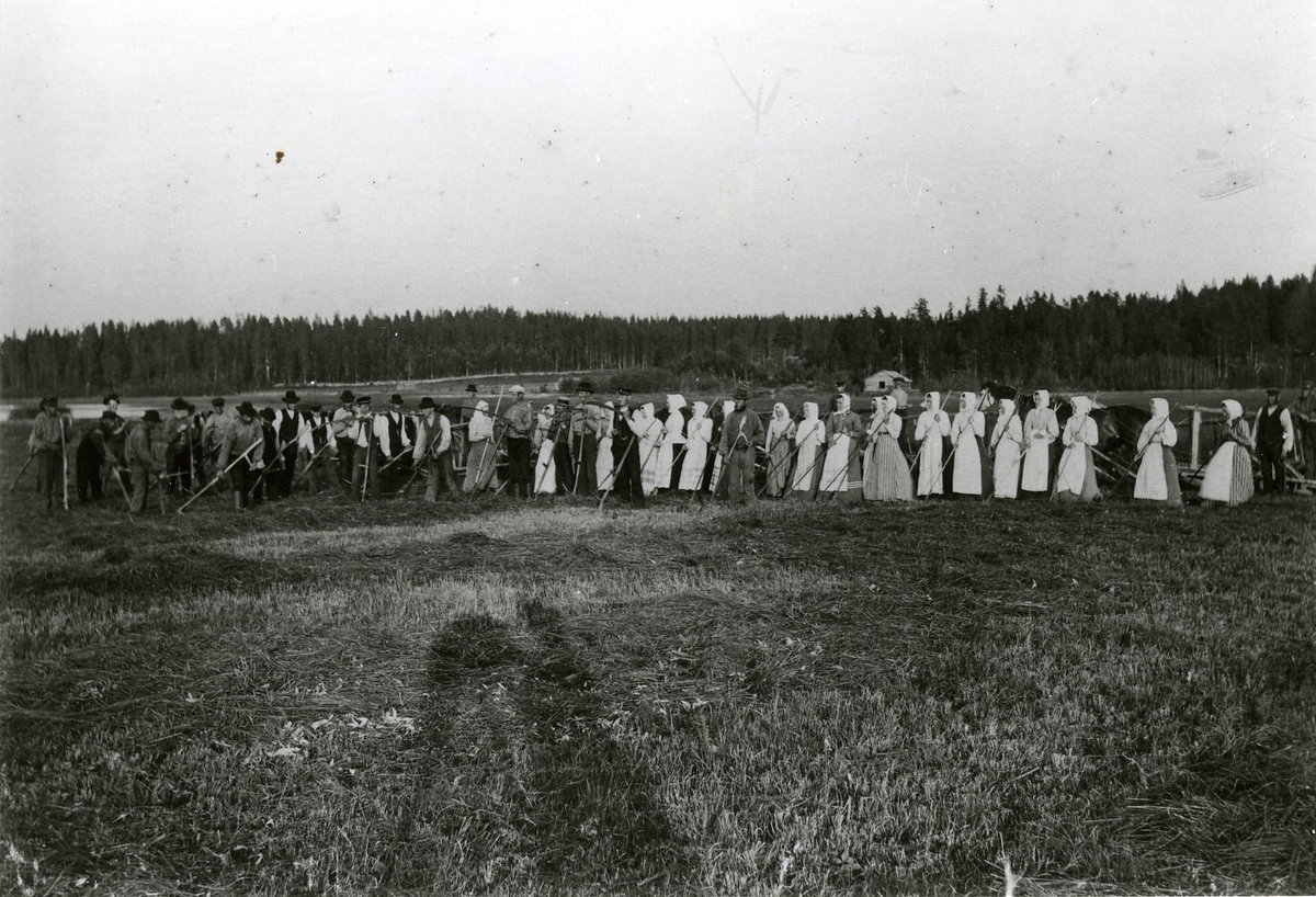 En man som slår med lie och en kvinna som binder neker och sätter upp i skyl.