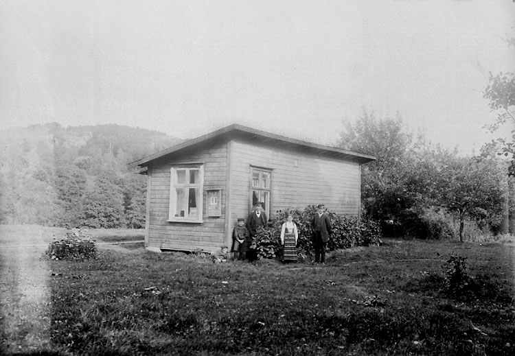 Två kvinnor och en man, samt tre barn står på en åker med en trädgård bakom dem. Framför trädgården går en stengärdesgård och mitt på fotot syns ett bostadshus.