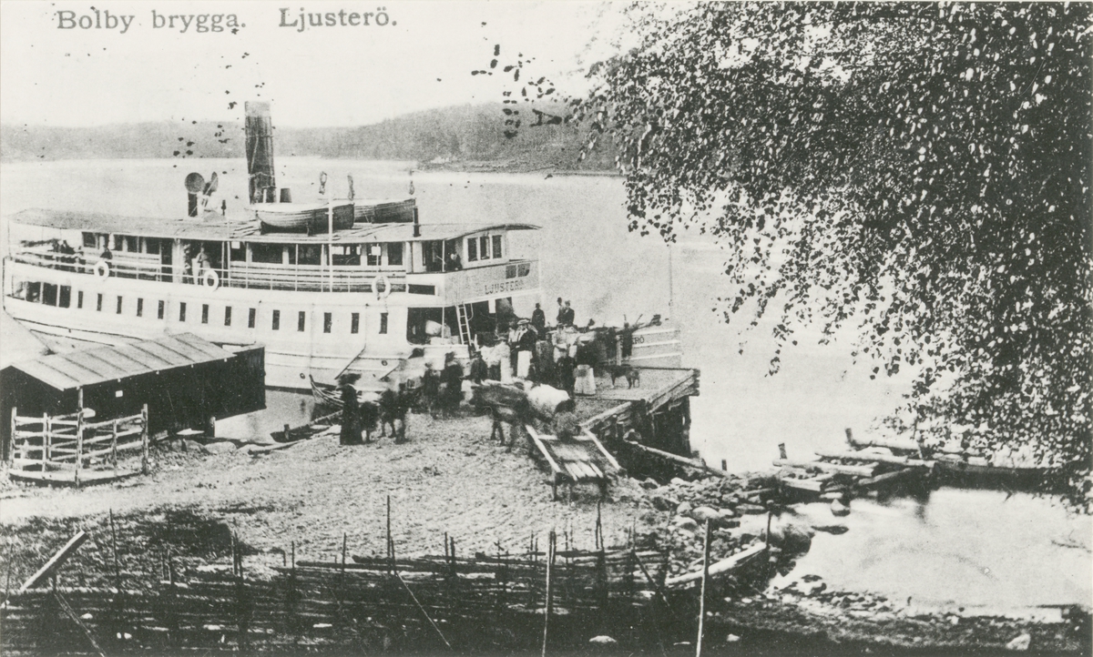 Foto i svartvitt visande passagerarångfartyget Ljusterö hemahörande i Ljusterö, vid Bolby brygga Ljusterö, omkring 1908-talet.