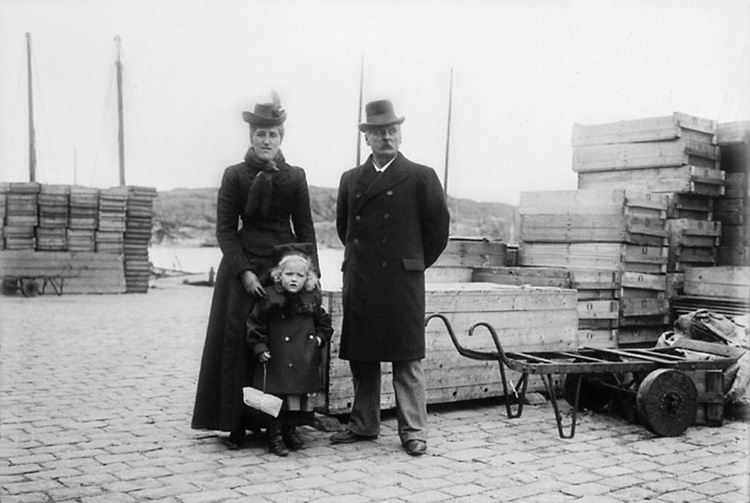Rektorsfamilj på kajen, med fisklådor vid sidan och i bakgrunden.