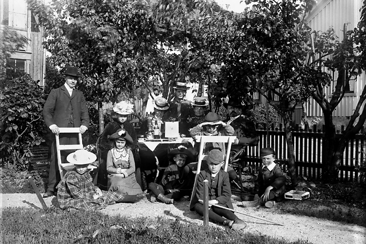 Kaffestund i trädgården. Ett sällskap (familj ?) har slagit sig ner, delvis i skuggan, för kaffe med avec.