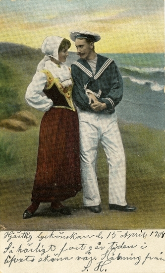 Postkort. En man och en kvinna står och omfamnar varandra på däck. De tittar leende in i kameran
