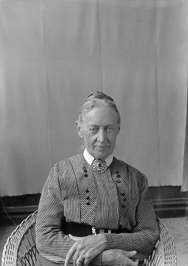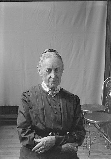 En äldre kvinna fotograferad i veranda "ateljèn". Till höger ser man två cafèstolar.
