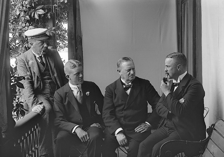 Fyra herrar samlade på verandan. En sitter på verandaräcket och de övriga på stolar, och två av dem röker pipa.