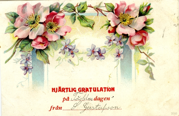 Notering på kortet: Hjärtlig Gratulation på födelsedagen från S Gustafsson.
