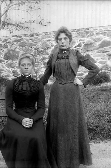 Två kvinnor poserar framför en gräsmatta och en hög stenmur.