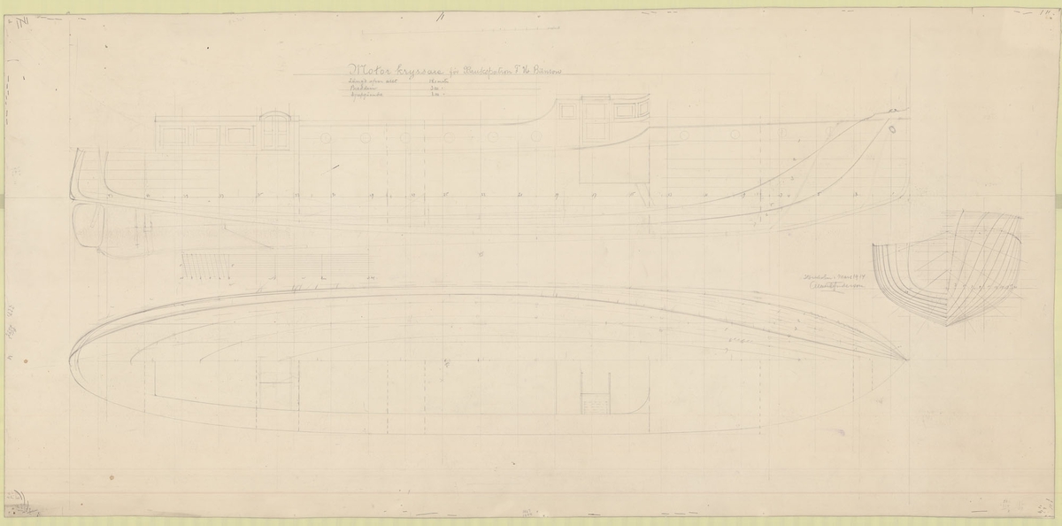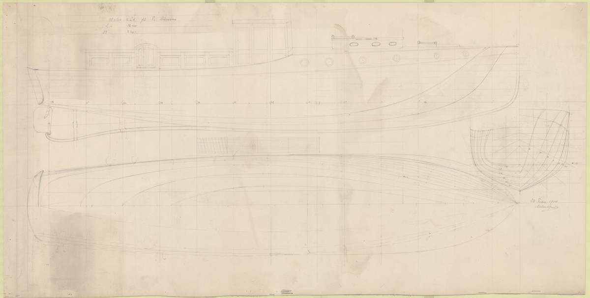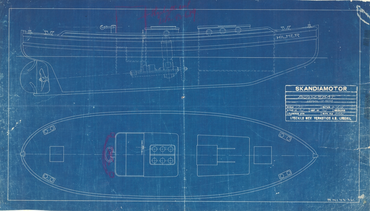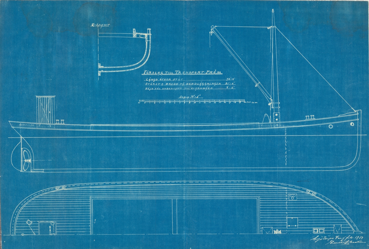 Hulda Pettersson är med kaffe hos sin bror Andreas och hans arbetskamrat Viktor Målarin när de bygger sandskutan Ella omkring 1914. Fotot gåva av E.V. Pettersson, Lungön 1952.