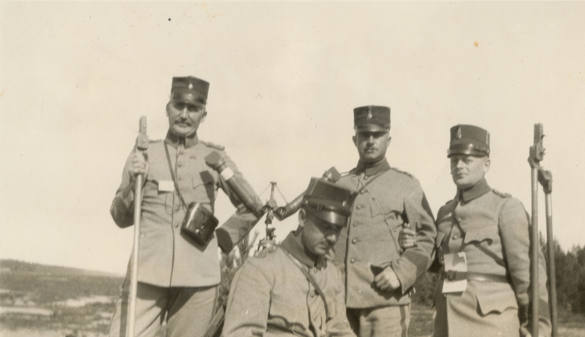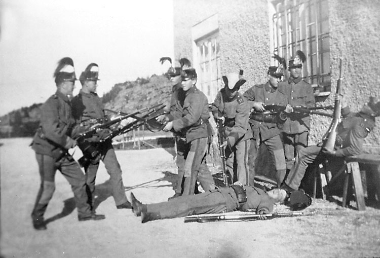 Grupporträtt. Sex armésoldater från I 4 och / eller I 5 regemente sitter i en backe. En av männen lägger an en träpinne som ett låtsasgevär.