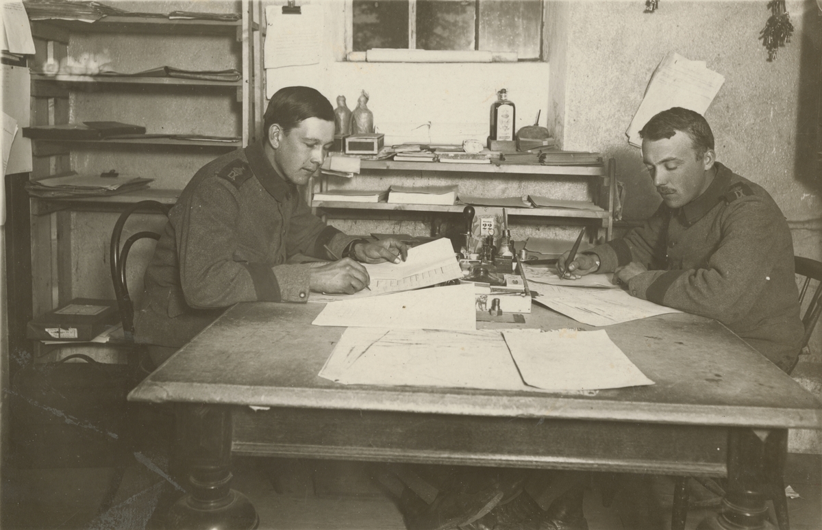 Två soldater från Södra skånska infanteriregementet I 25 i kontorsarbete.