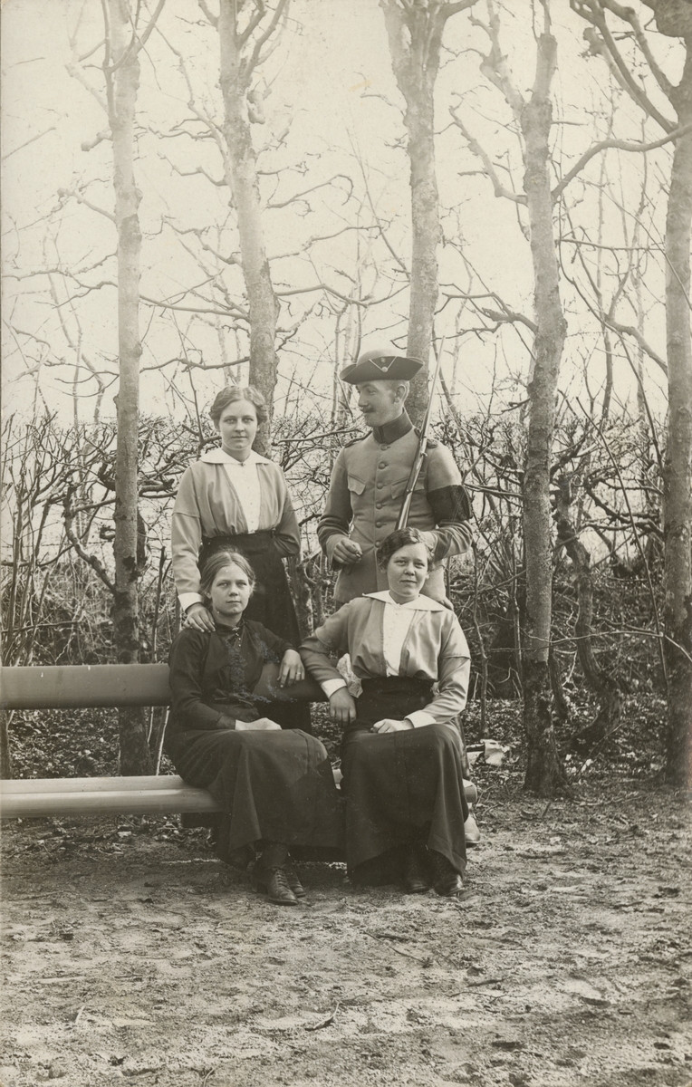 Gruppbild med tre kvinnor och en soldat från Södra skånska infanteriregementet I 25 på wn bänk i trädgården.
