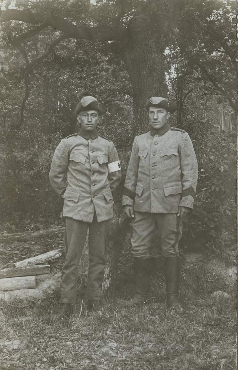 Två soldater vid Södra skånska infanteriregementet I 7 framför ett träd.