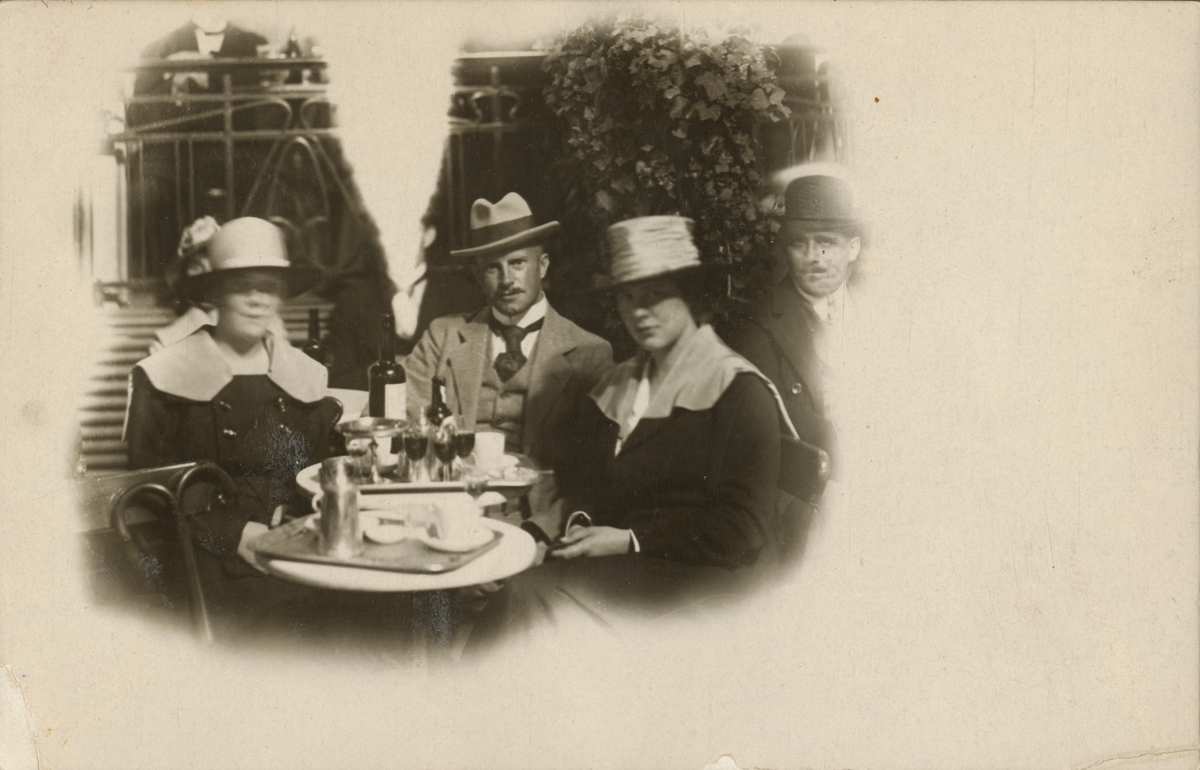 Tre män i Landstormsuniform och en kvinna sitter på en bänk i en trädgård i Löttinge, Täby, 1914. På bordet står flera flaskor.