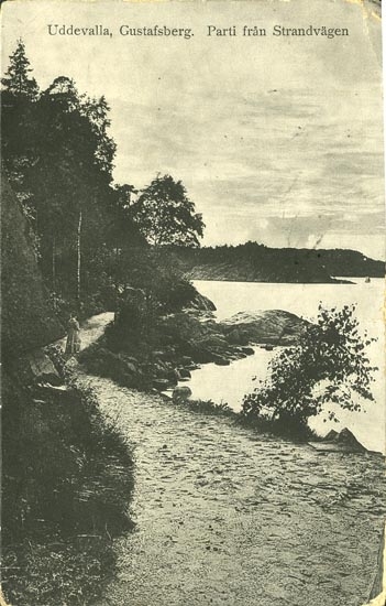 Tryckt text på vykortets framsida: "Uddevalla, Gustafsberg. Parti från Strandvägen."