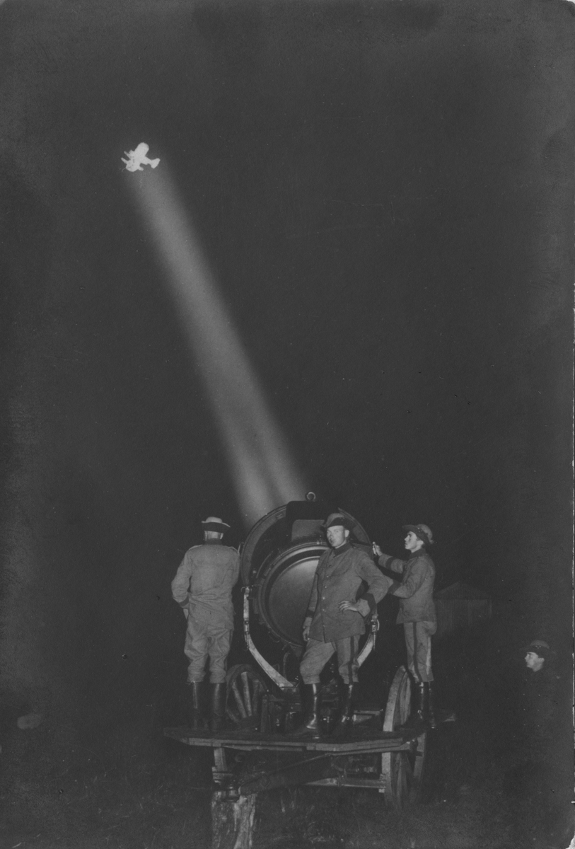 Ett flodljus riktas mot flygplan i luften, nattetid. Fyra militärer i arbete.