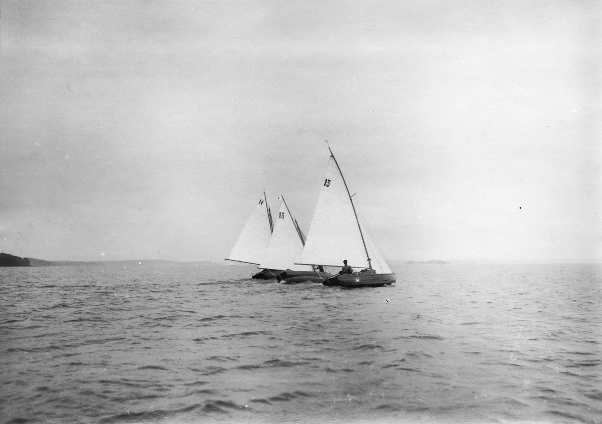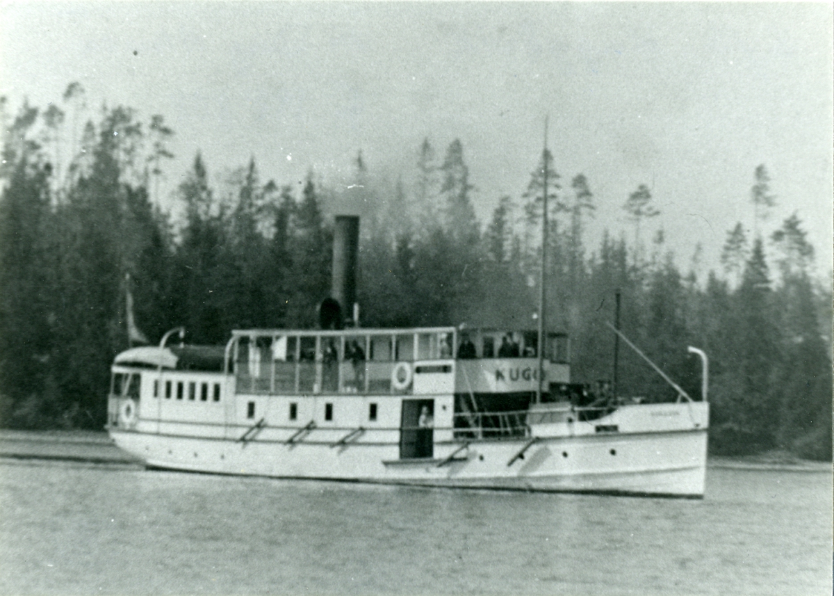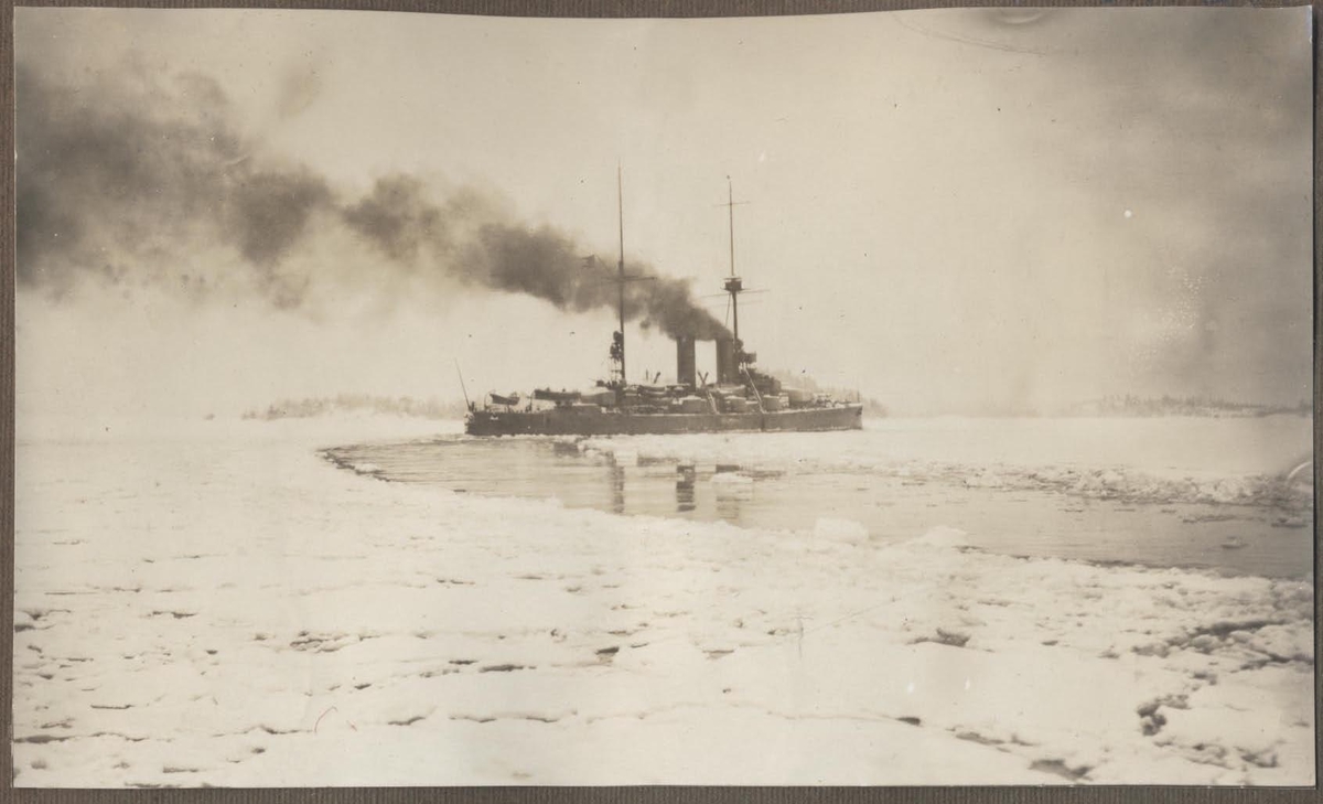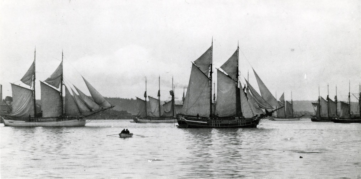 Vy av Sundsvalls hamn 1918. Lastade vedskutor på väg till Stockholm.