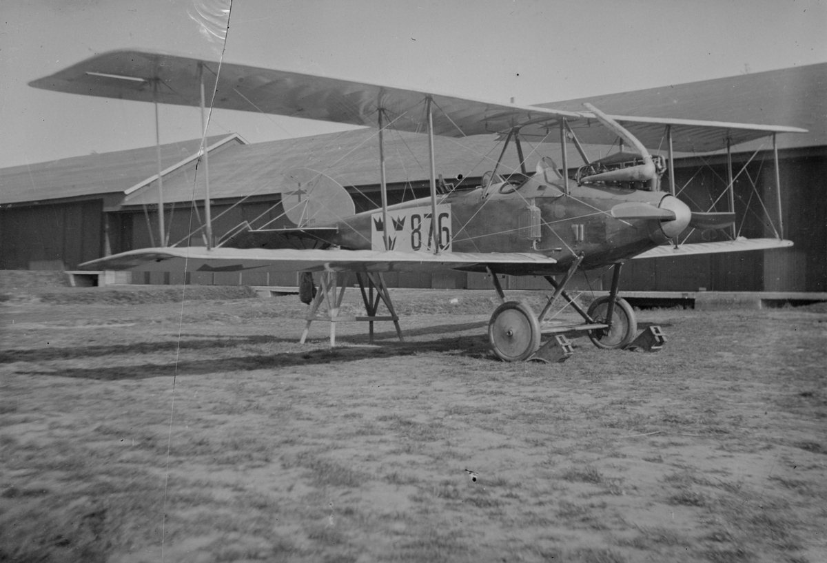 Flygplan Thulin typ FA märkt nummer 874 samt flygplan Albatros BIIa på ett flygfält. Militärer runt flygplanen.