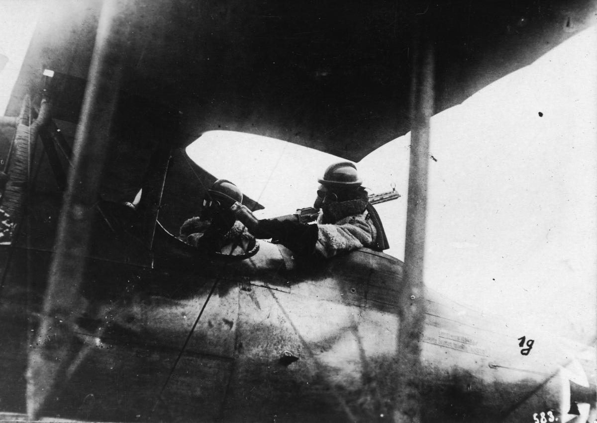 Förare och skytt på plats i flygplan Thulin FA märkt nummer 864 på marken.