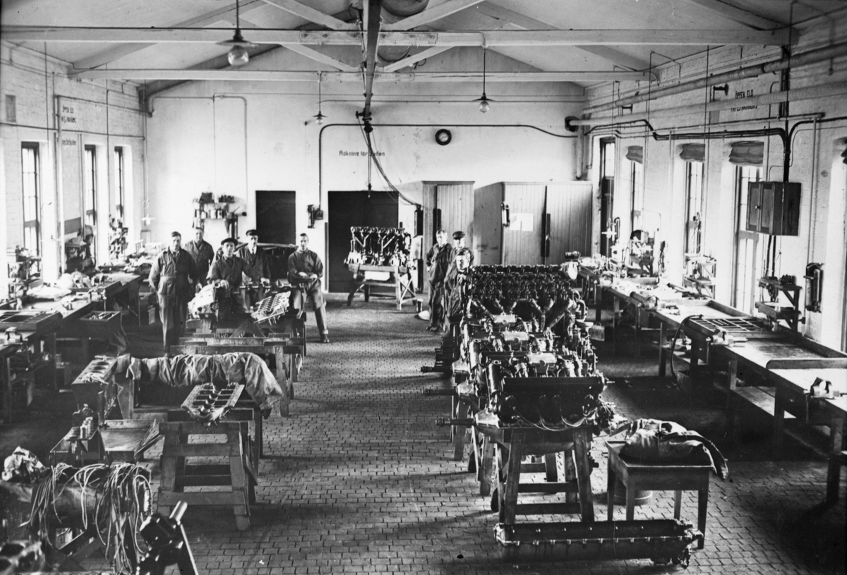 Interiör av motorverkstaden på flygverkstäderna i Malmslätt. Sju verkstadsarbetare uppställda.