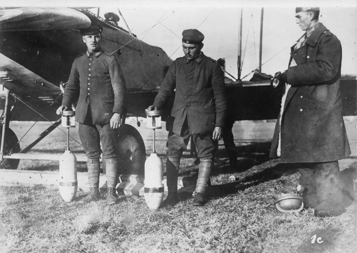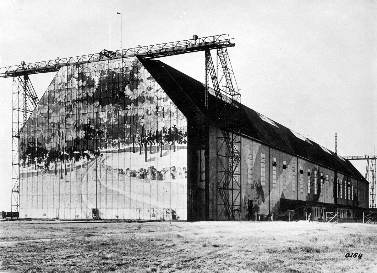 Första världskriget: Tysk luftskeppshall, vars gavlar bemålats med landskap, och sidorna med ränder i olika färger, för att härigenom vilseleda fientliga flygare.