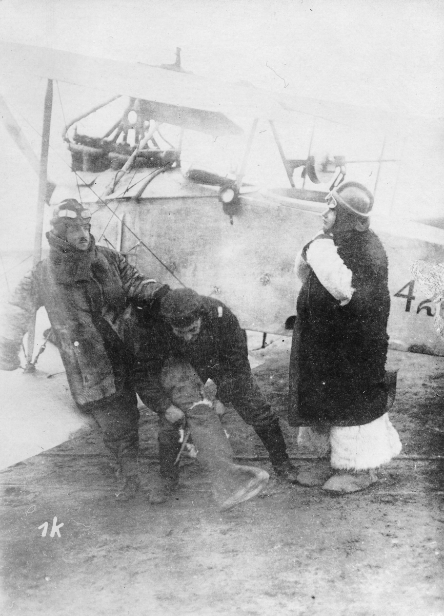 Grupporträtt. Sex stycken militära flygare och två hundar framför flygplan Thulin K och Triplanet på flygfältet på Flygkompaniet på Malmen, vintertid, 1918. Från vänster: Gösta D:son Carlson, Gus