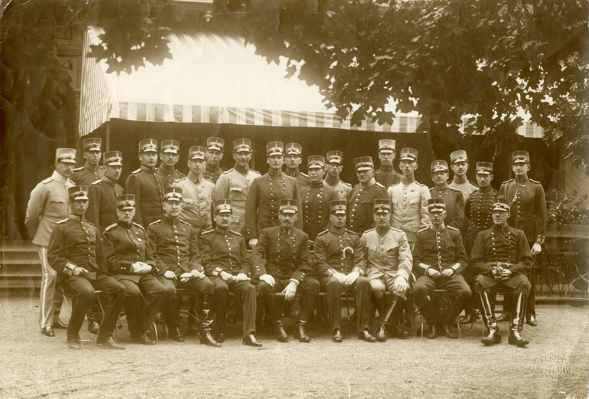 Grupporträtt av officerare vid V. Arméfördelningen under fältövningar i Sala, augusti 1918.