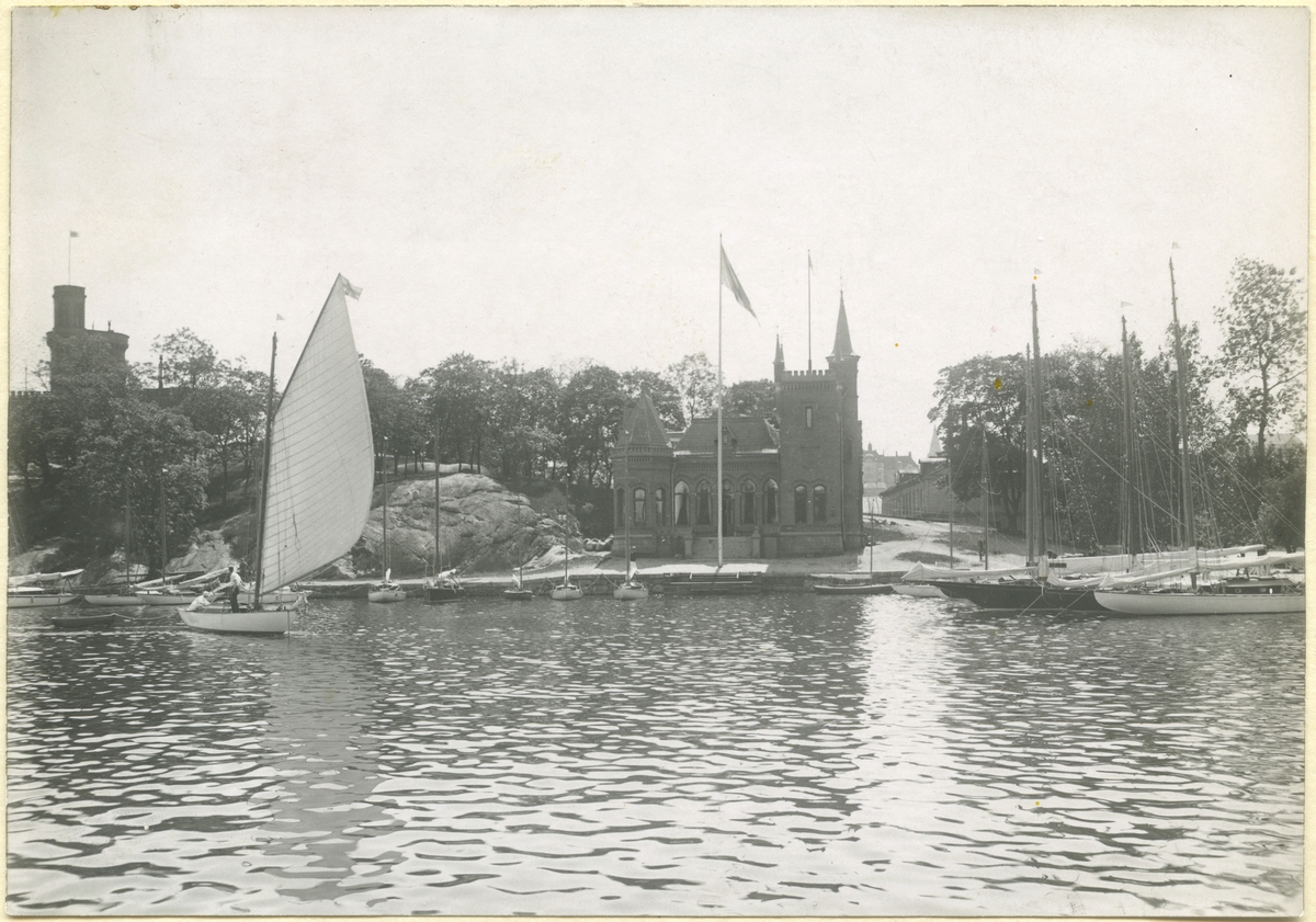 Fotot taget i skymningen från Sandins föräldrahem Söder Mälarstrand 10 - 12, med utsikt över Riddarfjärden. I förgrunden S. Mälarstrands kaj. Omkring 1918-20.