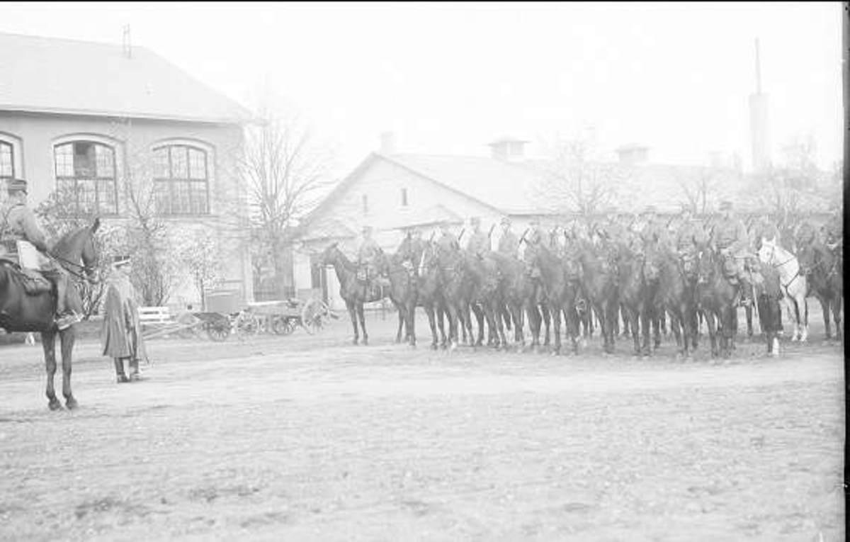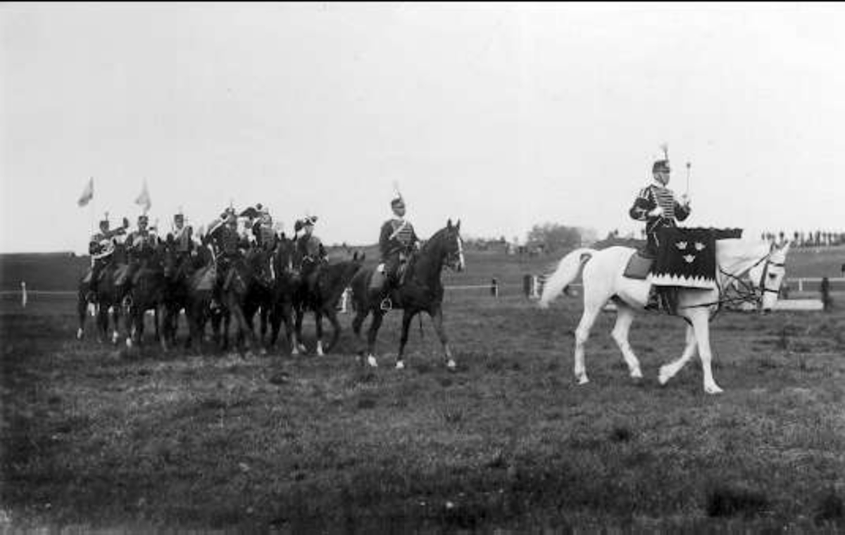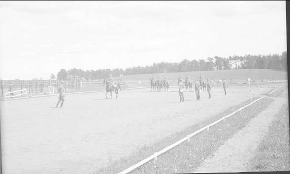 Kavalleriinspektör general G Gyllenstiernas inspektion av dressyrridning på dressyrbanan öster ridhuset. I bakgrunden Dunkehallshöjden.