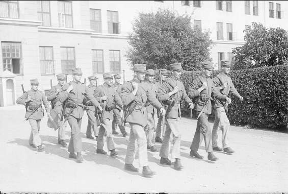 Trupp ur aspirantskolan på marsch från kasern för övning i terrängtjänst.