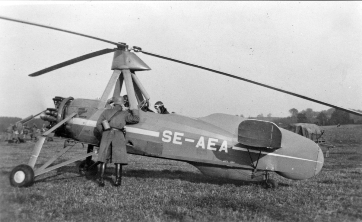 Tre stycken flygplan S 6 från F 3 Östgöta flygflottilj och flygplan Cierva C-30 med registreringsnummer SE-AEA står på linje på flygfält.