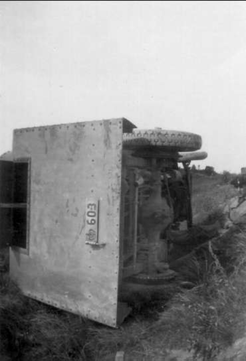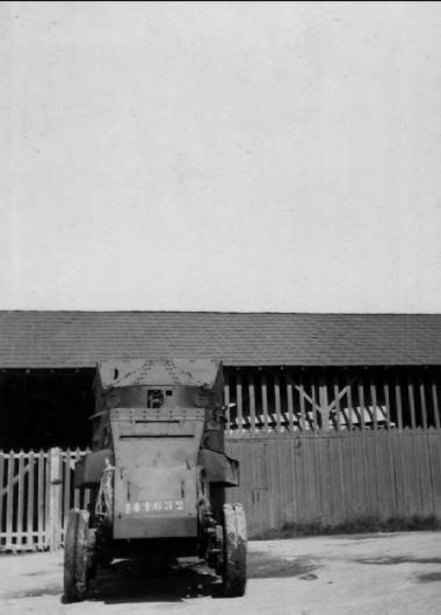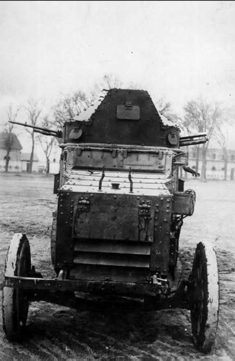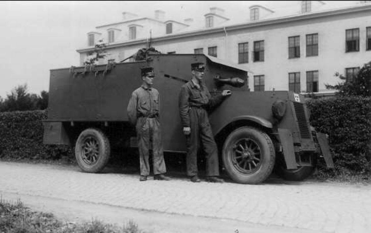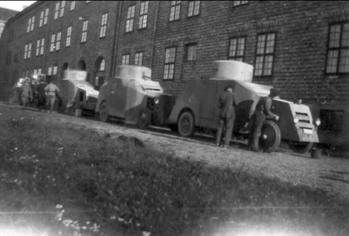 Svenska pansarbilar utanför garaget i Skövde, från vänster: m/1925, m/1926, m/1925, m/1931.