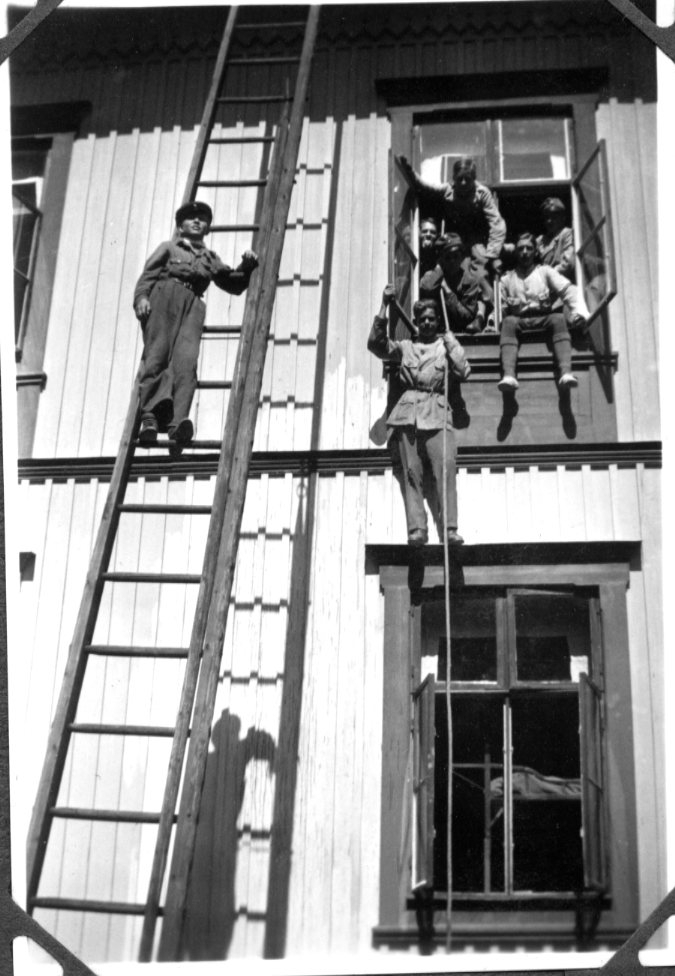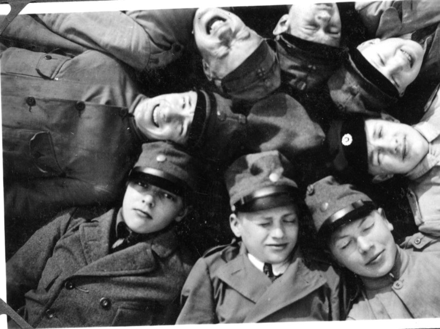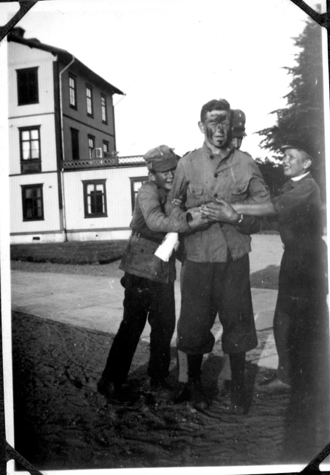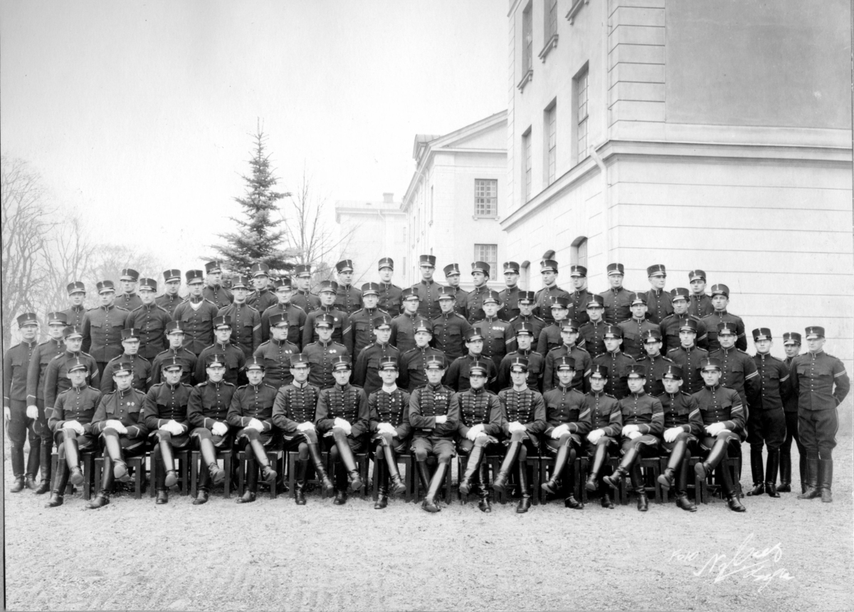 Del av aspirantskolan avlämning på kaserngården före övning. Med ryggen mot kameran löjtn. Stig Reuterskiöld, K 4.