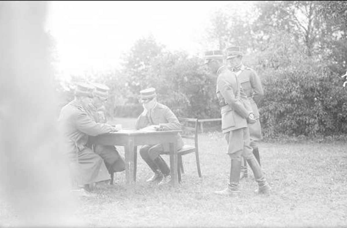 Sammanfattning av kritik efter övning. Från vänster: övlt Henry Peyron K 3, general Göran Gyllenstierna, övlt Åke Hök, löjtn. Stig Roempke K 3, ryttm. Harald Strömfelt K 3 (skolchef), serg. C E Hasselgre