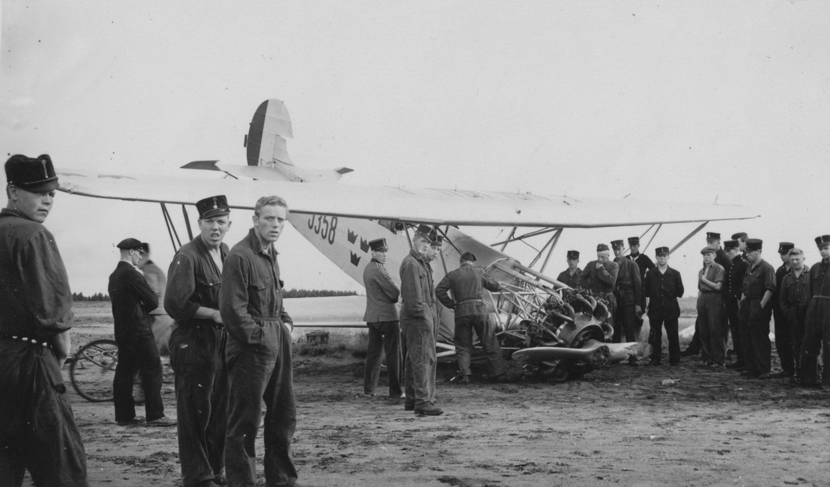 Haveri av flygplan S 6 från F 3 Östgöta flygflottilj. Folksamling runtomkring.