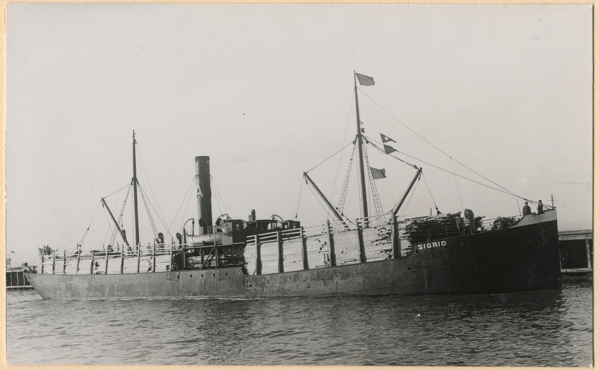 Lastångfartyget SIGRID av Landskrona år 1937. Minsprängd i Kielbukten den 1 nov. 1941. Omkomna 11 man.