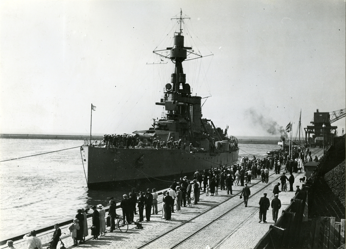 Pansarskeppet Drottning Victoria förtöjer vid kajen i Oceanhamnen - det är första gången ett pansarfartyg gått ända in till kajen i Hälsingborg.