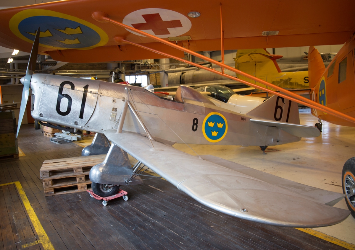 Flygplan J 8 Gloster Gladiator märkt 6 står på Malmens flygfält. Vy framifrån.