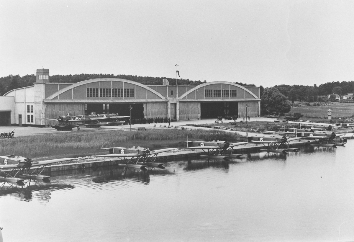 F 2 Hägernäs flygstation med hangar 81. Sex stycken sjöflygplan S 5 vid kaj. Vid hangaren syns, från vänster, ambulansflygplan Trp 2 samt två stycken flygplan S 5C.