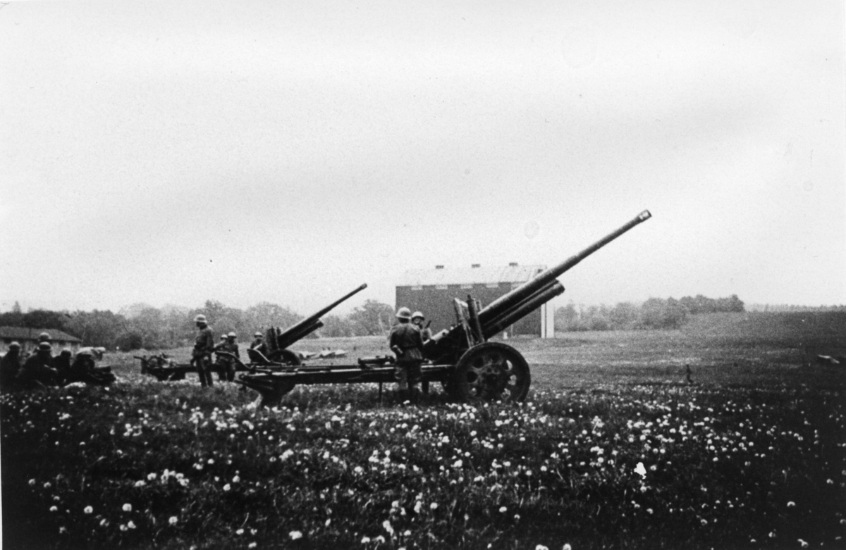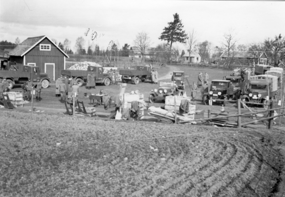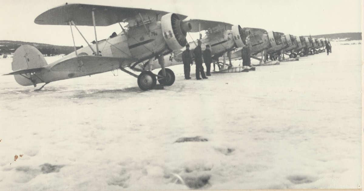 Flyget i Karlsborg innan F6.B 4:or på Bottensjöns is 1938. Förstoring. Bilden monterad på papp.